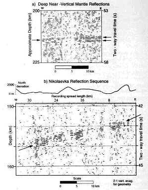 The URSEIS seismic reflection profiling in the southern Ural Mountains also recorded data from the upper mantle beneath the Earth's crust. The two-way time (TWT) to these reflections is 22-24 seconds, i.e. features at 80-100 km depth. These reflections may represent a continuation of the Main Uralian Fault (MUF) into the sub-crustal lithosphere (Steer et al., 1998). Deeper reflections at 35-45 seconds TWT (140-160 km depth) and 55 seconds TWT (225 km depth) may image mafic intrusions near the base of the lithosphere or along localised shear zones in the upper mantle (Fig. 11).